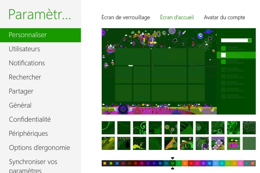 Windows 8 intègre un nouveau « centre des paramètres du PC », une sorte de panneau de configuration dédié à l’univers tactile et aux paramètres les plus utiles au quotidien. Il est important de prendre le temps de l’explorer. Il comporte de nombreuses fonctions de personnalisation pour vous aider à construire un environnement véritablement personnel et unique.