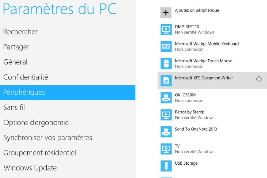 Il n’a jamais été simple d’avoir une liste des périphériques installés sur Windows et de supprimer ceux dont on n’avait plus besoin ou dont on s’était débarrassé. Microsoft a enfin découvert la simplicité : allez dans le nouveau centre des paramètres du PC et ouvrez la section Périphériques. Instantanément vous voyez tout ce qui a été connecté un jour au PC. Pour alléger le système, sélectionnez les éléments devenus inutiles et cliquez sur le « – » pour les retirer définitivement.