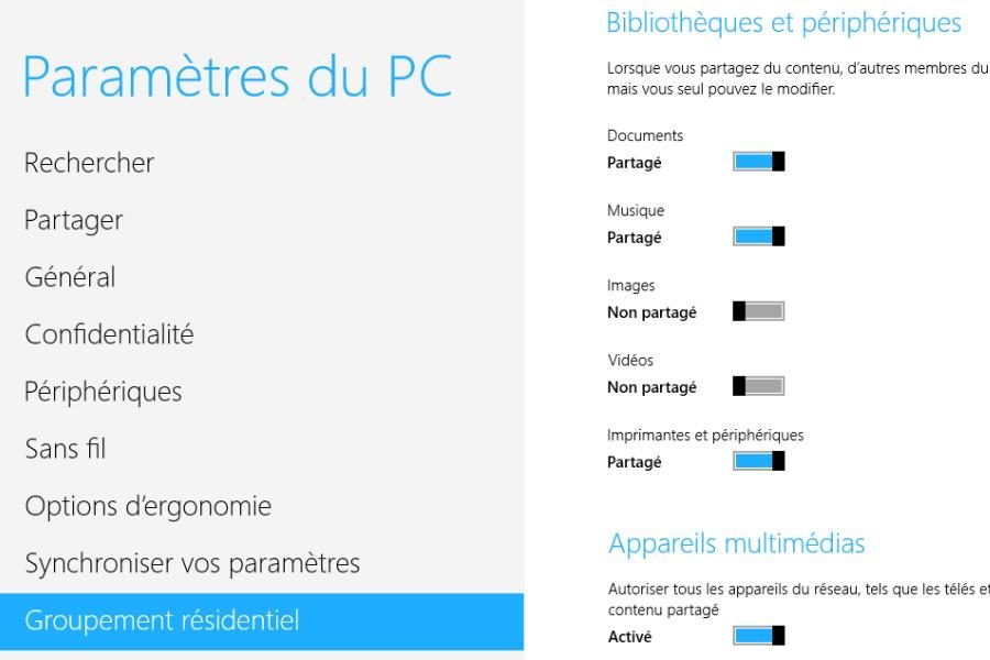Partagez ses fichiers, ses musiques, ses vidéos, ses photos entre tous les appareils du foyer n’a jamais été simple. Aujourd’hui ça l’est. Windows 7 avait introduit l’idée de « Groupe résidentiel » mais sa mise en œuvre était cauchemardesque. Désormais, un nouvel écran vous permet de gérer tout ça avec une simplicité enfantine. Ça se passe dans le centre des paramètres du PC, dans l’onglet Groupement résidentiel.