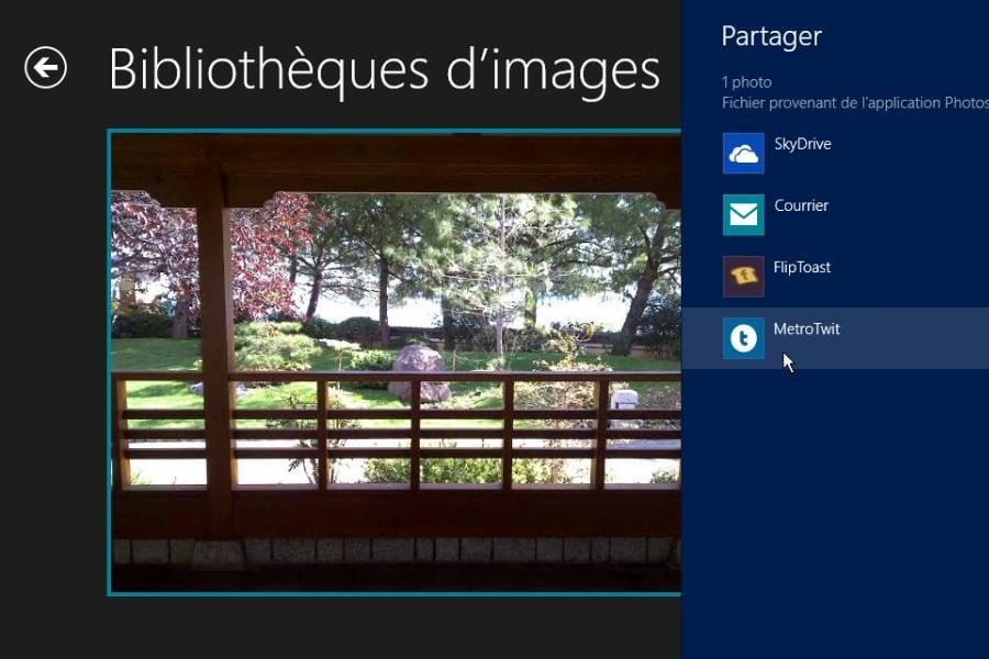 Windows 8 introduit un concept un peu nouveau : chaque app installée est susceptible de communiquer ses capacités aux autres apps afin de les enrichir. Par exemple, un logiciel de retouche photo n’a pas à savoir publier sur Facebook ou sur Twitter. Mais il suffit d’installer une app Facebook ou Twitter pour que soudain l’app photo sache le faire. Il suffit simplement d’appeler le talisman Partager. Plus votre système s’enrichit en apps, plus ce talisman devient utile. Il peut être vu comme un super Copier/Coller qui permet d’ajouter une info dans une app et de déclencher une action sans quitter l’app de départ. Malin !