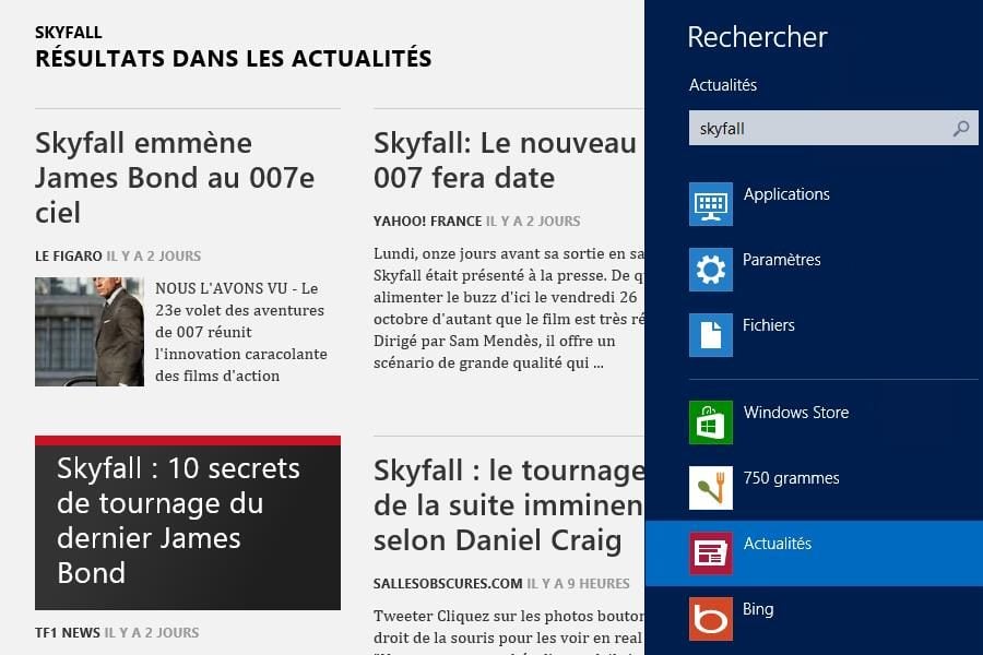 La recherche prend une toute autre dimension dans Windows 8. Toutes les apps passent par la fonction de recherche centralisée (le talisman Rechercher) pour réaliser leur fonction de recherche. Quoi que vous recherchiez, quoi que vous soyez en train de faire, vous pouvez tout trouver instantanément.