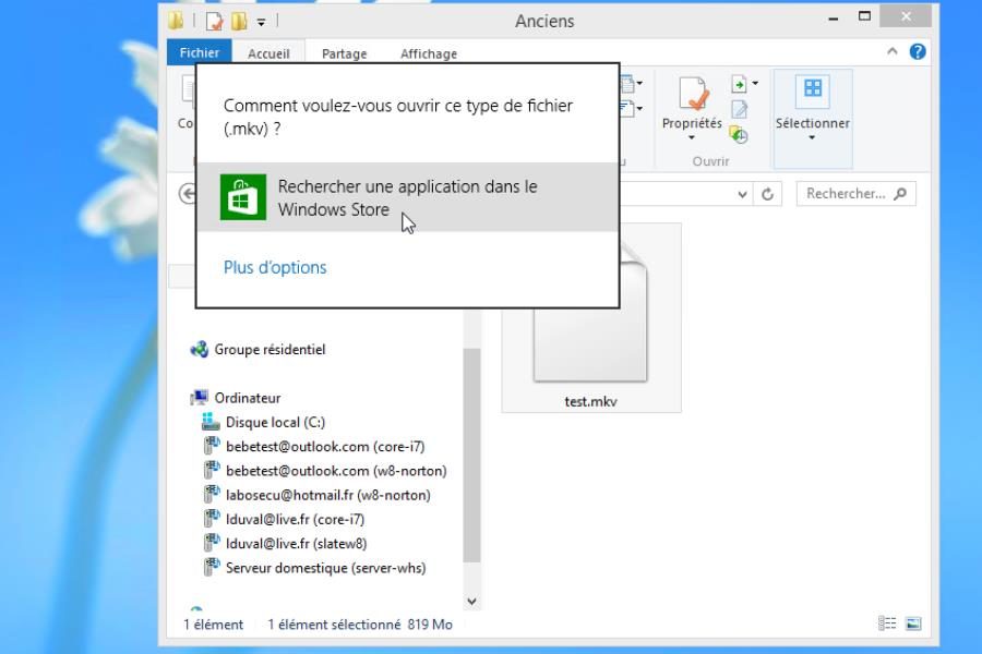 Lorsque l’on double-clique depuis le Bureau sur une extension de fichiers inconnue, Windows 8 vous propose de vérifier si une app du Windows Store sait ouvrir ce fichier ! Pratique.