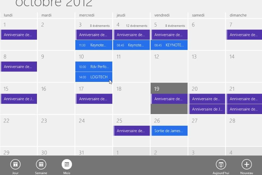 Lui aussi n’est vraiment pas sexy, mais le gestionnaire de calendriers de Windows 8 a le mérite d’être simple et synchronisé avec le cloud. Il agrège les événements provenant des calendriers de Facebook et autres services en ligne. Microsoft aurait quand même pu faire appel à des graphistes pour nous livrer quelque chose de visuellement plus séduisant.