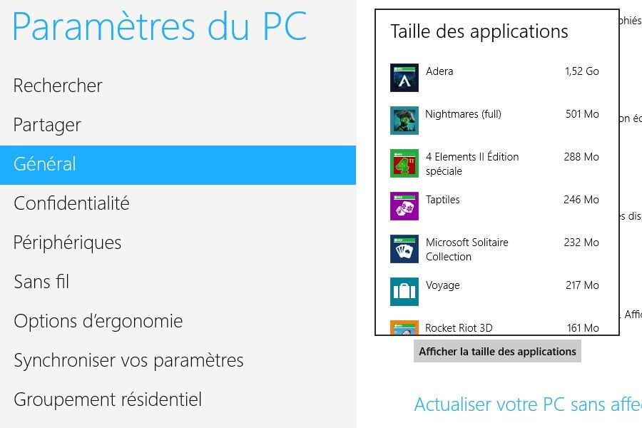 Si vous avez besoin de faire de l’espace très rapidement, le plus simple est souvent de supprimer un jeu ou une app gourmande quitte à la réinstaller plus tard. L’onglet Général du centre des Paramètres du PC s’en charge. Cliquez sur Afficher la taille des applications. Une liste apparaît affichant les apps triées de la plus volumineuse à la plus légère.