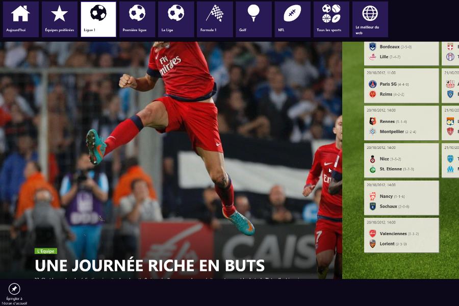 Windows 8 est également livré avec une collection d’apps conçues par Bing : une app de recherche sur le Web et les apps Météo, Cartes, News, Sports, Finance et Voyage. Chacune est une sorte de lecteur RSS survitaminé qui, outre l’agrégation de différents flux, propose quelques services comme les classements des principaux championnats sportifs (Bing Sports), la réservation de vols ou hôtels (Bing Voyage), le suivi des indices boursiers (Bing Finance), etc.