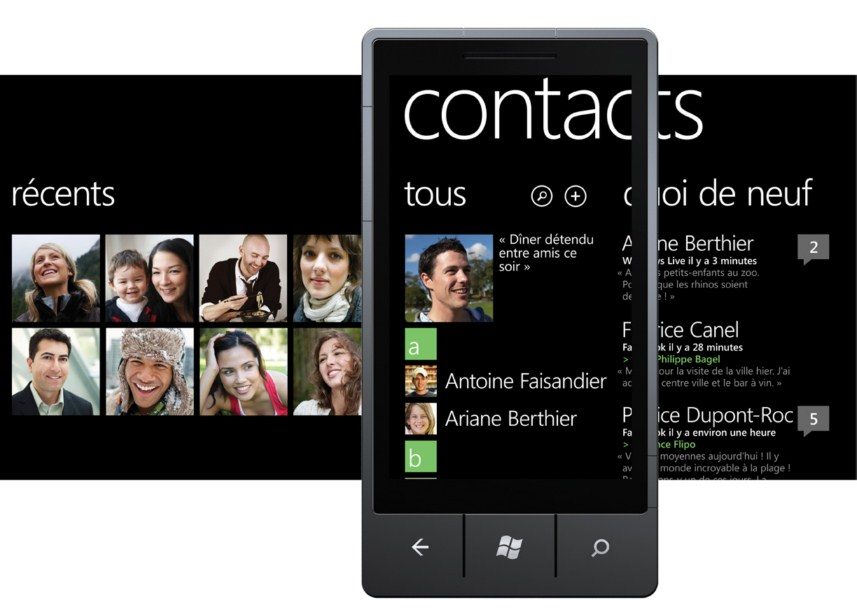 Le « hub » regroupant les contacts a été particulièrement soigné par Microsoft. Outre leurs coordonnées, cet espace permet de retrouver toute l’actualité de vos contacts sur les réseaux sociaux sans agvoir à passer d’une application à une autre : Facebook, Windows Live et LinkedIn sont de la partie… mais pas Twitter.