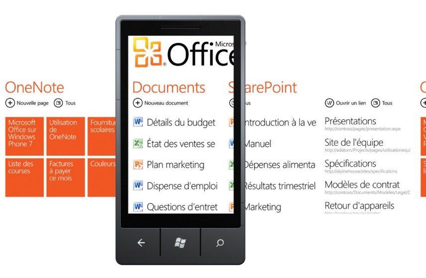 Le « hub » Office permet d’ouvrir et d’éditer des documents Word, Excel ou Powerpoint en respectant leur mise en page et en permettant de récupérer ou de partager ses propres documents via Sharepoint. Enfin, l’outil de prise de notes de Windows Phone 7 n’est autre que le puissant Onenote.