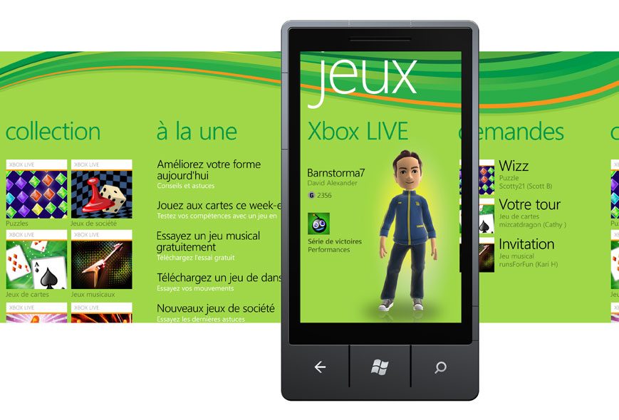 Xbox Live, la plate-forme communautaire de jeux de Microsoft, est présentée un des grands points forts de Windows Phone 7. Et pour cause, elle pourrait bien séduire les dizaines de millions de joueurs de la Xbox 360 qui disposent déjà d’un pseudo, d’un avatar et d’amis gamers sur leur console de salon. D’autre part, les jeux Windows Phone 7 utilisant l’ensemble d’outils XNA déjà utilisés sur Xbox, le développement est plus facile pour les programmeurs.