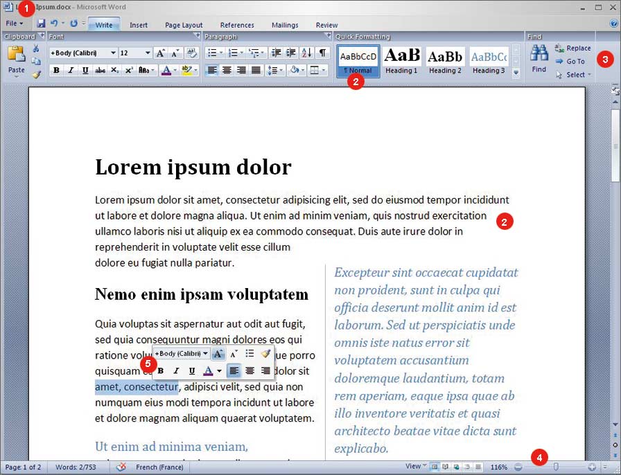 ribbon en anglais. Les onglets proposent des usages précis (Ecrire, Insérer, Mise en Page, Références, Mailing, Révision), et affichent les fonctions disponibles adéquates selon ce que l’on est en train de faire,