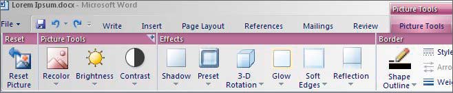 De nouveaux groupes de fonctions peuvent ainsi apparaître selon l’usage : si l’on insère une image et qu’on la sélectionne, un onglet proposant des outils de retouche d’images apparaît