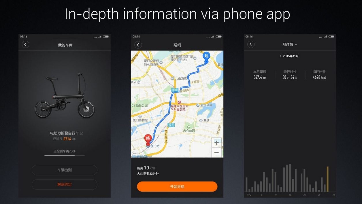 Sur le guidon, un petit écran donne des informations en temps réel telles que la vitesse, la distance, la puissance et même les calories consommées. Xiaomi a également doté son Mi QiCYCLE d’une interface Bluetooth et prévu une application pour smartphones qui affiche l’état du vélo, des données de navigation GPS et des statistiques concernant les différents trajets effectués.