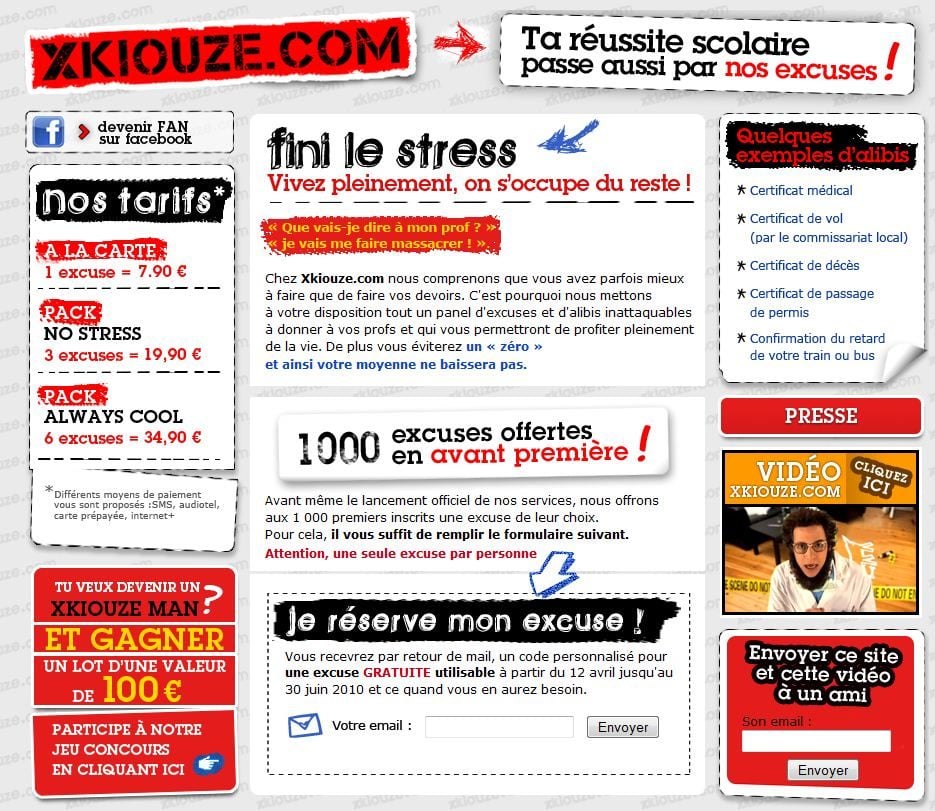 Tout cela ressemble bien à un coup fumeux pour provoquer du buzz. D’autant que, en attendant son ouverture, Xkiouse utilise quelques subterfuges pour recueillir des adresses : 1 000 excuses offertes aux premiers inscrits et un concours récompensant d’un cadeau d’une valeur de 100 euros les élèves les plus imaginatifs dans la création d’un alibi.