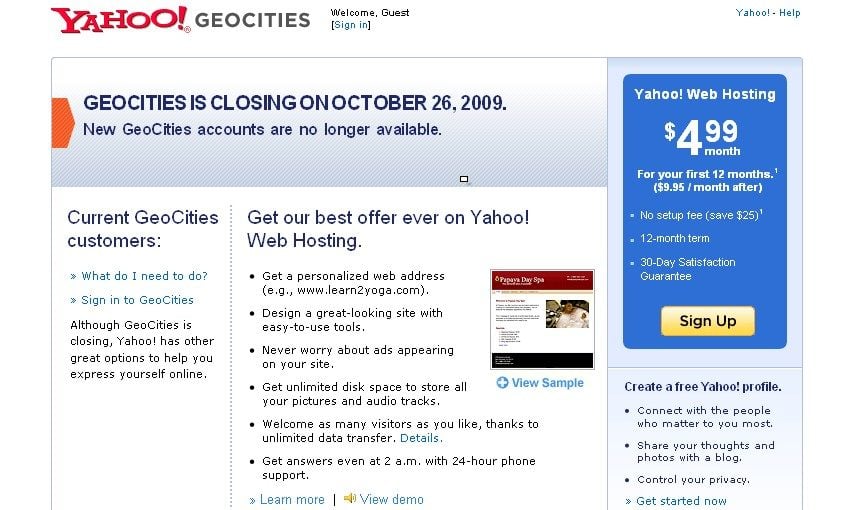 C’est écrit en toutes lettres sur la page d’accueil de Geocities : sur décision de Yahoo! – qui l’avait acheté en 1999 pour 3,5 milliards de dollars, en pleine bulle Internet –, c’en est fini du service d’hébergement gratuit depuis hier, lundi 26 octobre.