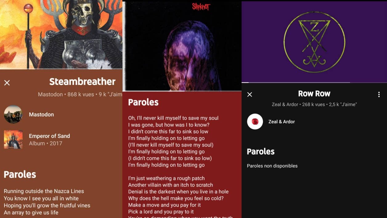 Nous avons fait quelques tests avec des morceaux de notre playlist. Les résultats sont visibles ci-dessus. Il est peu étonnant que les artistes et chansons les plus connus soient – bien entendu – privilégiés par YouTube. Les autres, un peu moins, même si leur prose est disponible dans les descriptions des vidéos présentes sur YouTube classique. Toutefois, nous avons quand même eu la bonne surprise de trouver quelques paroles de chansons en norvégien, polonais et suédois de groupes plutôt confidentiels.