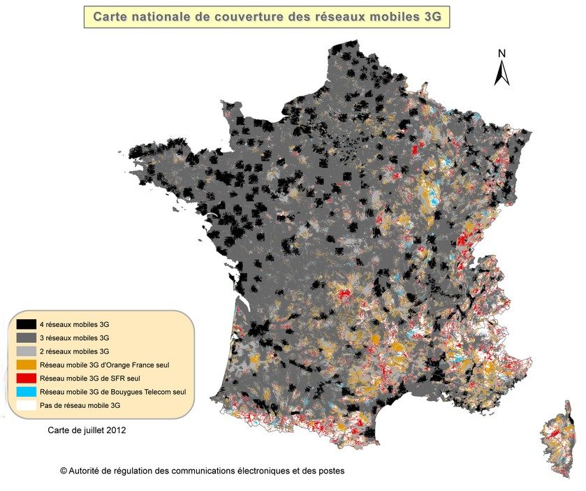 En France, la majorité des zones blanches (zones couvertes pas aucun des opérateurs de téléphonie mobile) se situe aussi dans des zones montagneuses indiquait l’Arcep dans un rapport de 2012. Onze départements concentrent presque 80 % des zones blanches avec en premier les Hautes-Alpes. Cela dit, pour l’Autorité de régulation, ces zones ne sont pas très peuplées et seules 88 communes étaient concernées à la fin 2011 contre 364 en 2008.