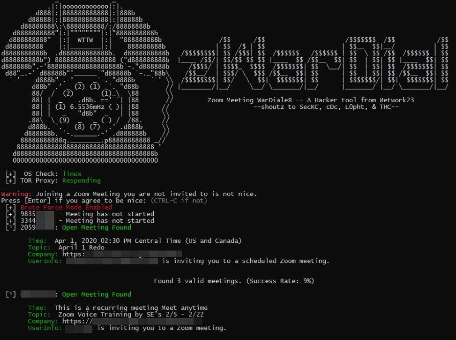 Et même si ce n’est pas le cas, il suffit d’oublier de définir un mot de passe de réunion pour que celle-ci soit repérable par des hackers. En effet, il est facile de scanner l’espace des identifiants de réunion et, ainsi, de détecter celles qui sont actives ou planifiées. C’est ce que fait le hacker Trent Lo avec son logiciel zWarDial.