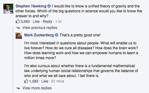 Le premier est le célèbre physicien Stephen Hawking. « De quelle grande question scientifique aimeriez-vous connaître la réponse et pourquoi ? ». Et la réponse du patron de Facebook n’en est pas moins intéressante : « Qu’est-ce qui nous permettra de vivre éternellement ? Qu’est-ce qui nous permettra de guérir toutes les maladies ? Comment fonctionne le cerveau ? Comment fonctionne l’apprentissage ? Comment pouvons-nous donner aux humains la capacité d’apprendre un million de fois plus ? Je suis également curieux de savoir s’il y a une loi mathématique fondamentale qui sous-tend les relations sociales entre les hommes et qui préside à l’équilibre de ceux à qui et ce à quoi on tient. Je parie qu’il y en a une. »