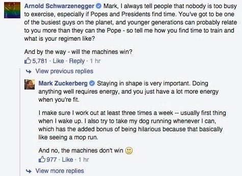 Changement de ton avec l’homme politique et acteur Arnold Schwarzenegger qui s’immisce dans la conversation pour savoir si Zuckerberg fait de l’exercice malgré son emploi du temps serré. « Je fais en sorte de m’entraîner au moins trois fois par semaine – généralement, c’est la première chose que je fais en me levant ».