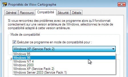 compatibilité pour : et, dans le menu déroulant en dessous, sélectionnez la version de Windows pour laquelle votre logiciel a été conçu. Validez par OK.