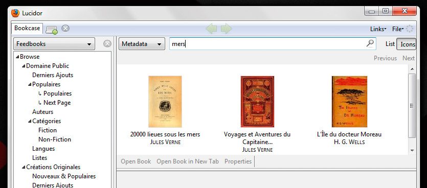 Cliquez sur Open the Bookcase pour ouvrir la Bibliothèque. Un menu déroulant s’affiche, qui vous propose différentes bibliothèques, positionnées sur Personnelle par défaut. Dans ce menu déroulant, choisissez Feedbooks (la principale source d’ouvrages en français), et cliquez sur Browse. Choisissez Domaine Public ou Créations Originales, puis promenez-vous dans les catégories pour trouver votre bonheur, ou utilisez le champ Metadata afin de lancer des recherches. Utilisez le bouton Icons, en haut à droite, pour une vue plus sympathique des œuvres.