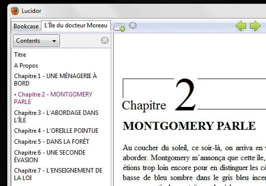 Un livre vous plaît ? Sélectionnez-le, et cliquez juste en dessous sur Open Book in a new Tab ; le livre se charge et s’ouvre dans un nouvel onglet. Lucidor affiche les chapitres en entier. Nous vous conseillons, pour passer d’une page à l’autre en cours de lecture, de n’utiliser que les touches Page Suivante et Page Précédente de votre clavier. En début et fin de chapitre, des boutons Previous et Next apparaissent en bas à droite, pour reculer ou avancer dans les chapitres. Vous pouvez aussi circuler dans le livre en utilisant la table des matières de gauche :