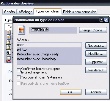 Sélectionnez la commande à éliminer, cliquez sur Supprimer puis sur OK. Recommencez pour les autres types de fichiers.