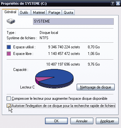 ressources, offre un gain négligeable au regard du ralentissement général qu’elle entraîne. Pour la désactiver, ouvrez le Poste de travail, faites un clic droit sur le disque C:, choisissez Propriétés dans le