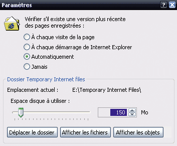 Outils, cliquez sur Options Internet. Dans la zone Fichiers Internet temporaires, cliquez sur le bouton Paramètres puis saisissez la valeur 150 dans le champ Espace disque à