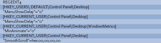 Windows, pour offrir une navigation plus souple à travers ses différents menus, prévoit un délai avant d’afficher les menus et quelques effets visuels. Afin d’obtenir une réactivité maximale, créez un fichier Reg avec le texte