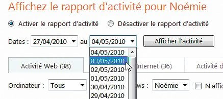 Depuis la page Contrôle parental, cliquez sur le lien Afficher le rapport d’activité. Avec les deux listes déroulantes, sélectionnez la date de début et de fin de la période à consulter et appuyez sur Afficher l’activité. La liste des sites Web consultés ou bloqués s’affiche. Pour autoriser l’accès à un site Web bloqué, cliquez sur Sélectionner dans la colonne Modifier les paramètres, puis choisissez Autoriser pour cette personne ou Autoriser pour tout le monde dans la liste déroulante. Choisissez plutôt Bloquer pour cette personne ou Bloquer pour tout le monde pour empêcher l’accès à un site Web. Activez l’onglet Autre activité Internet pour consulter la liste des programmes ayant utilisé la connexion Internet.