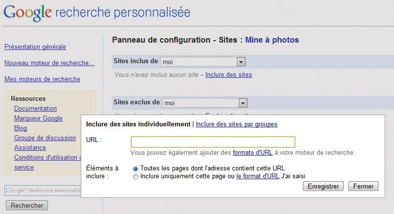 Une fois connecté, le destinataire de l’invitation peut ajouter des sites. Il lui suffit de cliquer sur Inclure des sites, de copier une adresse dans la zone URL et de cliquer sur Enregistrer. Le site est immédiatement pris en compte par votre moteur de recherche. En tant que créateur, vous avez la possibilité à tout instant de supprimer le nom d’un contributeur.
