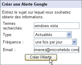 Dans la zone Créer une alerte Google, tapez les mots-clés ciblant votre recherche. Par exemple football lyon ou windows vista. Choisissez ensuite la fréquence des envois (une fois par jour,