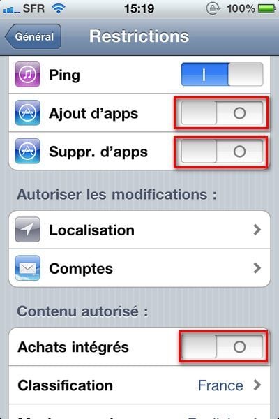 Dans l’écran suivant, désactivez tour à tour : Ajout d’apps, Suppr. d’apps et enfin, plus bas, Achats Intégrés. L’avantage de cette solution est qu’il est facile de rétablir la configuration normale en désactivant les restrictions. Pour finir, retournez dans le menu Général, puis Réglages.