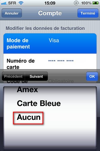 Cliquez à présent sur Mode de paiement. Dans l’écran suivant, dans la partie Données de facturation, cliquez encore sur Mode de Paiement. Déroulez le menu jusqu’à Aucun. Validez par OK. Puis appuyez deux fois sur Terminé. De cette manière, vous êtes complètement protégé d’un éventuel achat impulsif.