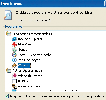 quel logiciel.Ouvrez un dossier contenant au moins un fichier du type concerné et cliquez avec le bouton droit sur son icône.Dans le menu contextuel qui se déroule, choisissez Ouvrir avec puis Choisir le programme.Une petite fenêtre affiche la liste de tous les logiciels installés. Cliquez sur celui qui a votre préférence, cochez la case Toujours utiliser le programme sélectionné pour ouvrir ce type de fichiers puis cliquez