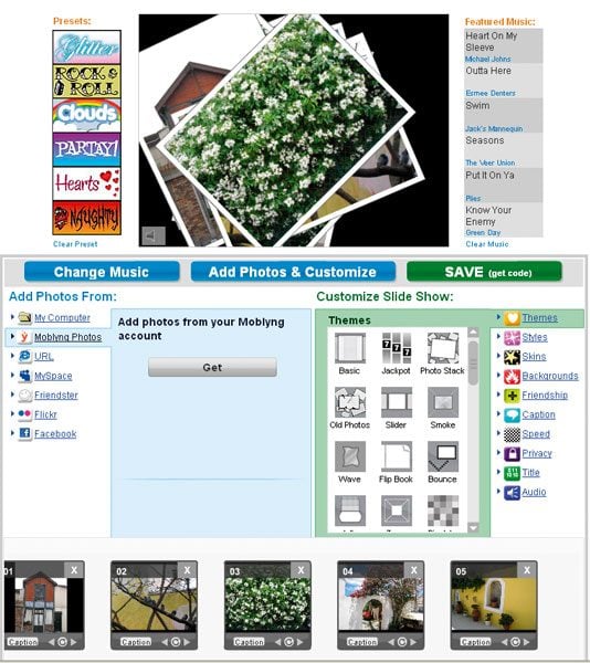 Cliquez sur l’onglet Slide shows en haut de la page d’accueil, inscrivez-vous puis téléchargez vos clichés sur votre ordinateur en cliquant sur Browse. Vous pouvez alors sélectionner un thème sur lequel défileront vos photos. Les choix ne sont pas toujours des plus originaux ni des plus sobres. En revanche, le champ des options est complet ; on peut ainsi ajouter des légendes, un titre et même un résumé, incruster des éléments tels que des cœurs ou un iPhone, déterminer la vitesse de défilement du diaporama, et enfin, choisir un morceau de musique parmi le catalogue plutôt bien achalandé du site ou depuis son propre ordinateur. Enfin, Fliptrack offre un large éventail de liens pour partager ses diaporamas : Facebook, Blogger, MySpace, etc.