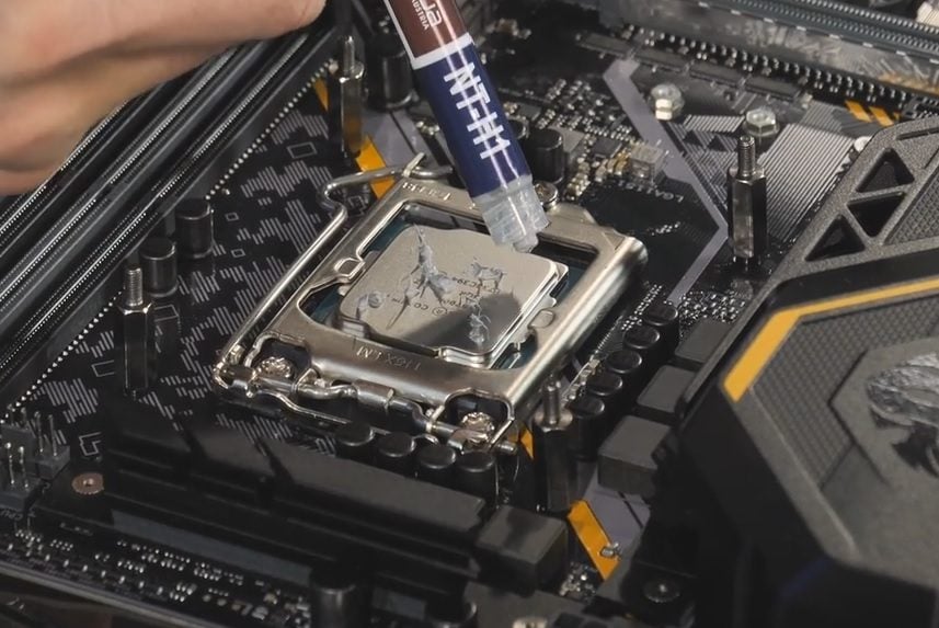 - Si la pâte thermique est un peu solide, déposez une petite quantité au milieu du processeur, puis trois autres points par diagonale.