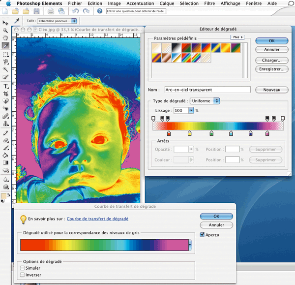 de dialogue qui s’affiche afin d’accéder à une nouvelle fenêtre. Cliquez à présent dans la zone de dégradé. Dans la nouvelle fenêtre qui s’affiche, choisissez l’effet Arc?”en?”ciel