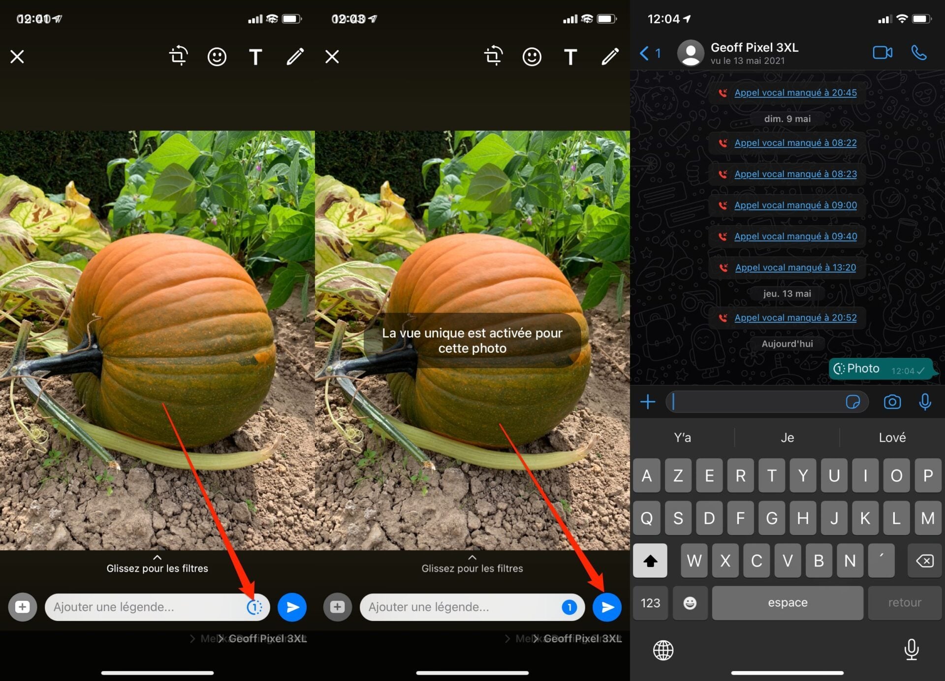 Le 1 passe en bleu et un message « La vue unique est activée pour cette photo » s’affiche, confirmant la bonne activation de l’option. Vous n’avez plus qu’à valider l’envoi de votre message