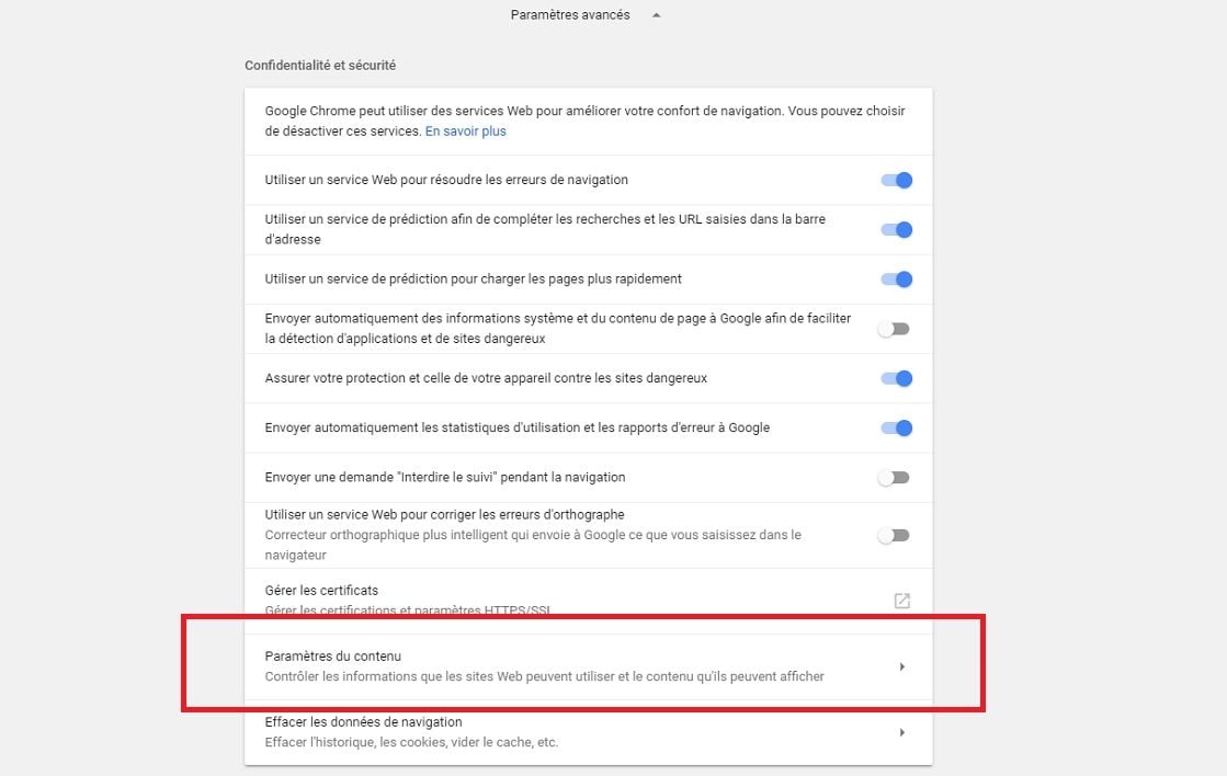 Sachez tout d’abord que Facebook vous tracke dès lors que vous surfez sur une page web contenant les boutons « Like » et « Share ». Il profite alors de vos cookies, ces petits fichiers d’informations qui sont stockés par votre navigateur, pour affiner votre profil publicitaire. Il est donc conseillé, quand cela est possible, d’utiliser le mode de navigation privée, disponible dans le menu du navigateur, ou de modifier les paramètres de ce dernier pour qu’il n’accepte pas certains cookies. Par exemple, dans Chrome, cliquez sur les trois petits points verticaux en haut à droite de l’écran, puis sur Paramètres. En bas de la page, cliquez sur Paramètres avancés, puis sur Paramètres du contenu.