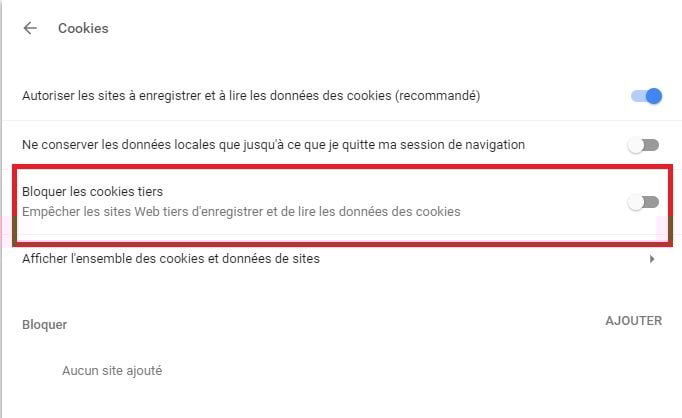 Cliquez ensuite sur Cookies, puis sur Bloquer les cookies tiers.