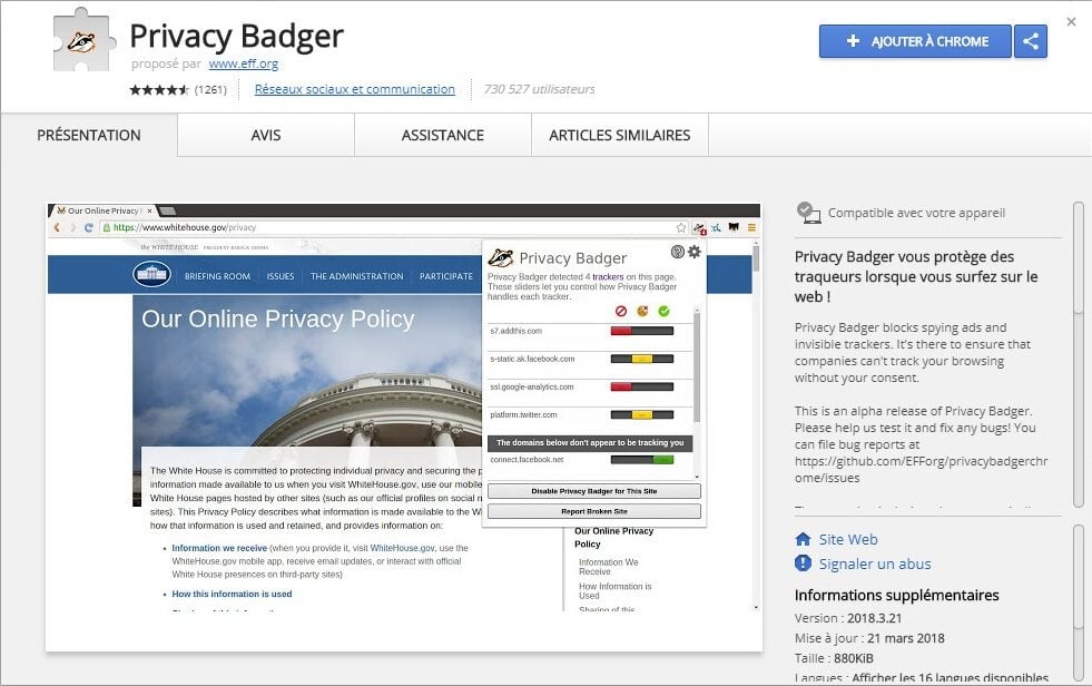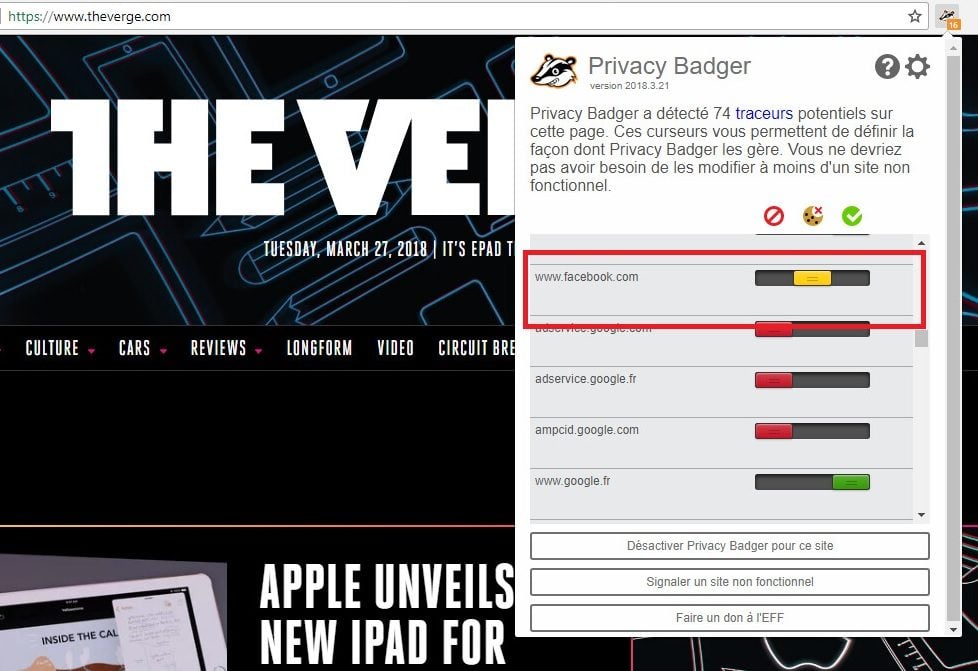 Une autre solution consiste à utiliser l’extension Privacy Badger conçue par l’EFF (Eletronic Frontier Foundation). Elle est disponible pour Firefox et pour Chrome.