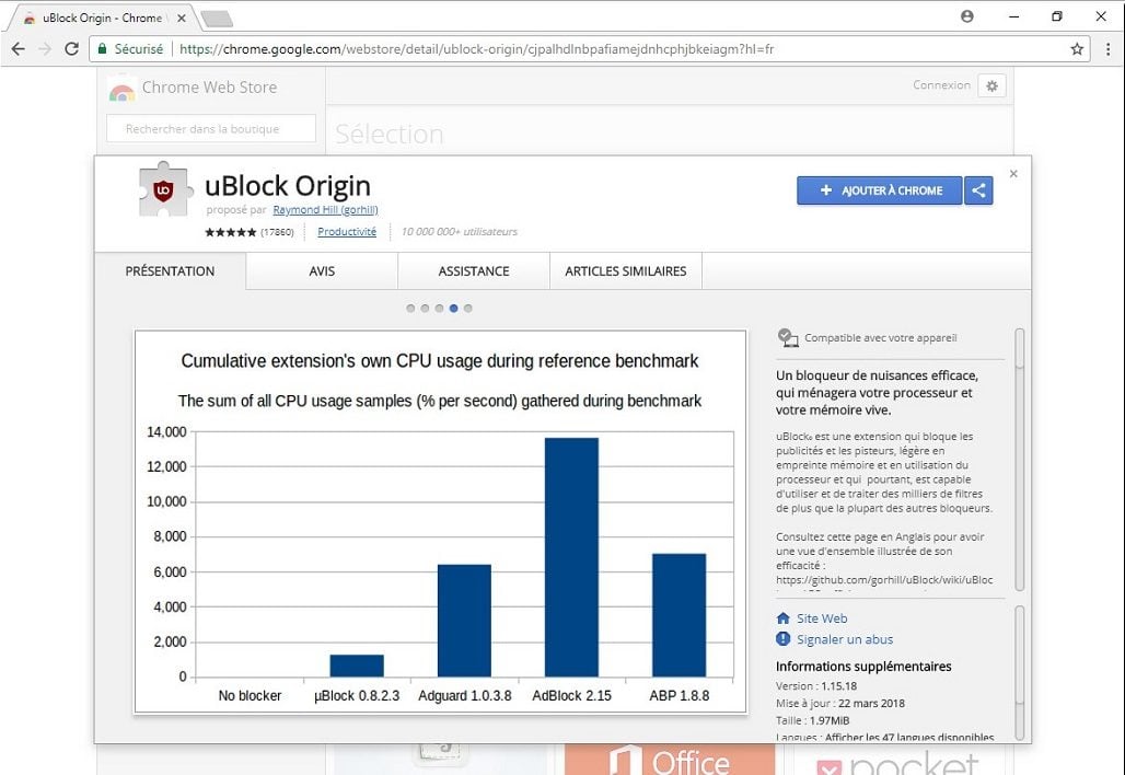 Les cookies ne sont pas les seuls moyens d’enregistrer des données vous concernant et certains sites font appels à des scripts qu’il convient de bloquer. Pour cela, la meilleure solution est d’installer une extension sur son navigateur. L’une des plus efficaces est uBlock Origin qui est disponible pour Chrome, Firefox, Opera et Safari. Elle est accessible en allant, par exemple, dans le webstore de Chrome, puis en cliquant sur le bouton Ajouter à Chrome. Cliquez ensuite sur le bouton Ajouter l’extension pour finaliser l’installation.