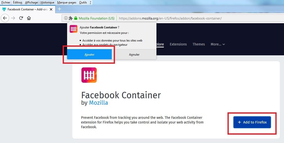 Firefox dispose pour sa part d’une nouvelle extension conçue par la fondation Mozilla. Téléchargez Facebook Container et cliquez sur le bouton Ajouter pour finaliser l’installation.