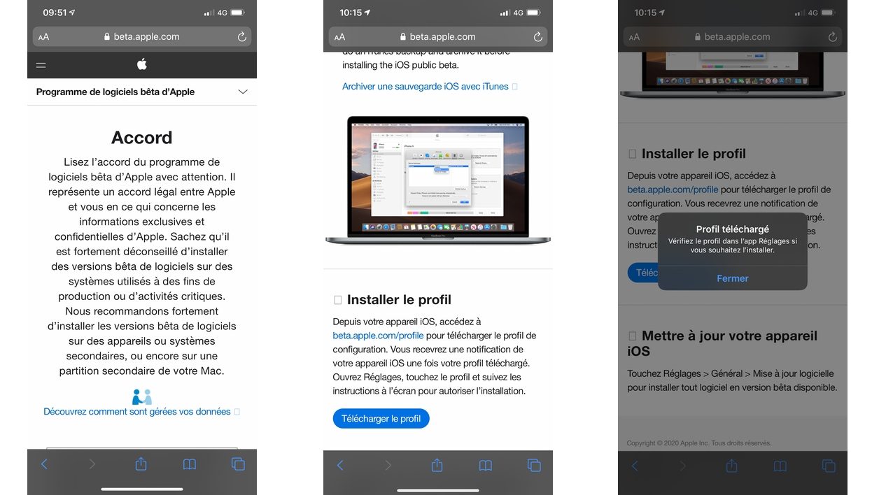 Sur la page d’accueil, dans sa partie Démarrer, cliquez sur Inscrire votre appareil. Il va vous falloir maintenant télécharger un profil qui va permettre l’installation de la bêta. Vous pouvez également vous rendre sur beta.apple.com/profile.