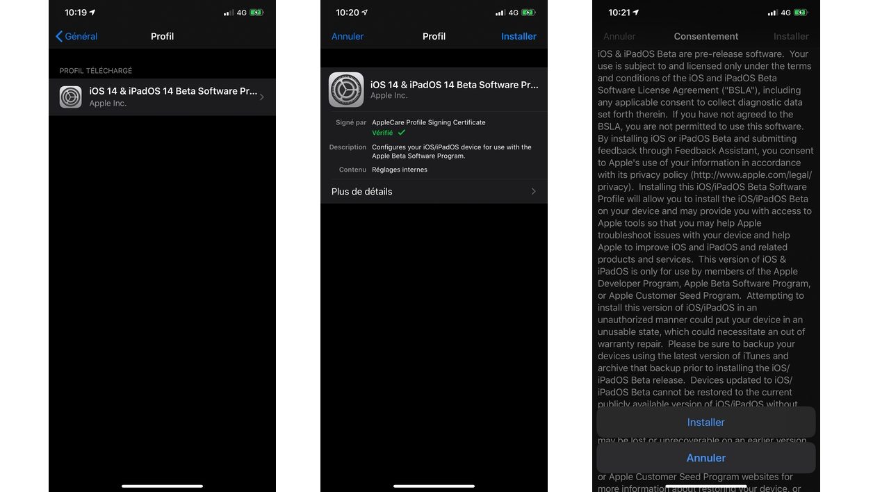 Sur votre iPhone ou votre iPad toujours, rendez-vous désormais dans Réglages/Général/Profil. Tapez sur le profil iOS 14 & iPadOS 14 Beta Software Program. En haut à droite de l’écran, tapez sur Installer. Saisissez votre code, et validez à nouveau votre accord en tapant sur Installer, et Installer encore une fois.