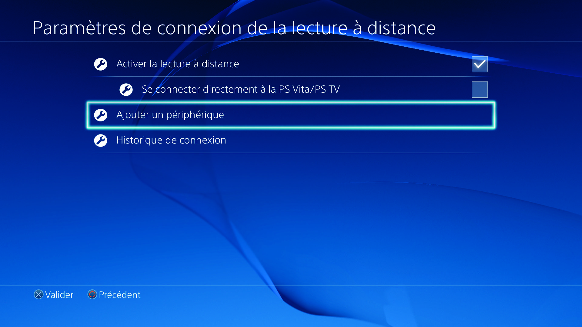 Rendez-vous ensuite dans le menu des “Paramètres” de votre PS4, puis sélectionnez “Paramètres de connexion de la lecture à distance”. Activez ainsi la lecture à distance en cochant la case correspondante (sur la première ligne affichée à l’écran), et choisissez ensuite “Ajouter un périphérique” : c’est là que vous trouverez le code à entrer dans l’application PlayCast afin de connecter votre iPad ou votre iPhone à votre console.