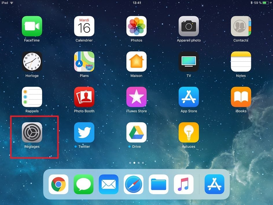 - Sur l’écran d’accueil, tapez sur l’icône Réglages.