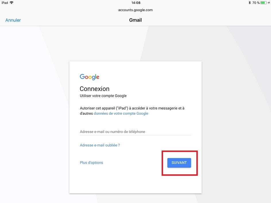 - Entrez votre adresse Gmail puis tapez sur le bouton Suivant. Répétez l’opération avec le mot de passe Gmail.