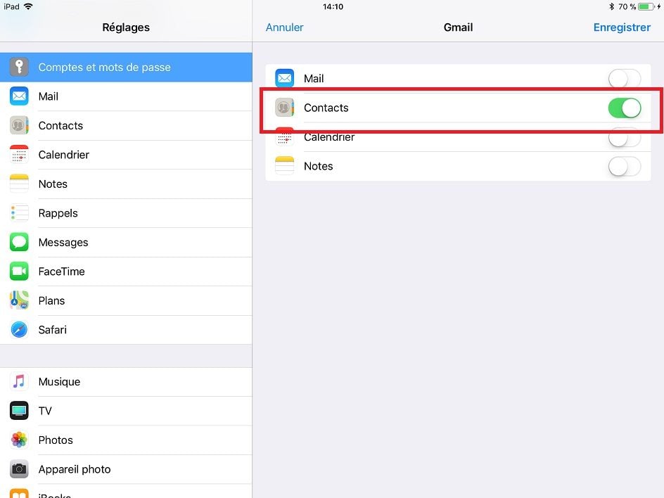 - Le compte Gmail est alors associé. Vérifiez que l’interrupteur Contacts est bien en vert. Si vous désirez juste les contacts, basculez les autres interrupteurs vers la gauche pour les désactiver. Ils deviennent alors blancs. Vous pouvez également associer d’autres services Google, comme l’agenda ou le mail, évidemment.